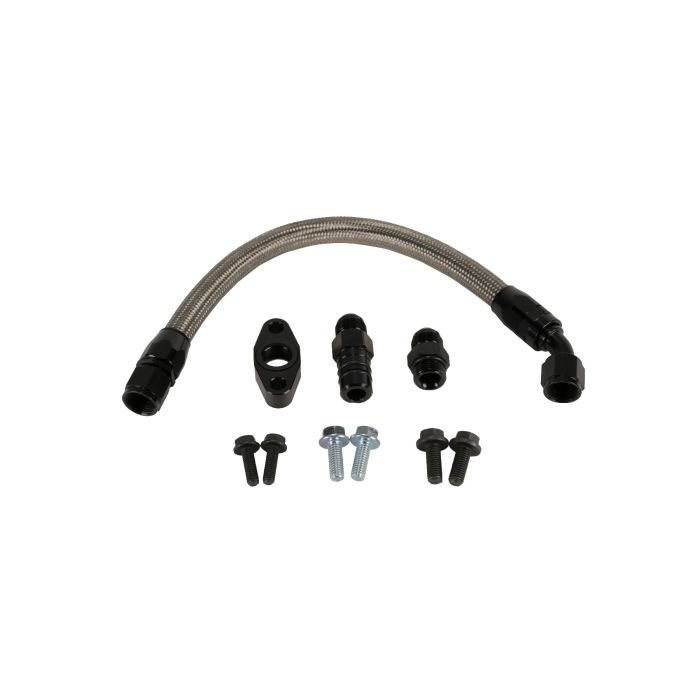 Put the finishing touches on your truck with this high quality Turbo Drain Tube Kit. The tube is braided stainless steel for durability on the exterior, and reinforced rubber tubing for flow and maximum flexibility. The kit contains everything you need to connect an S300/S400 turbo drain back to the factory drain location on the Cummins block when using a fixed vane geometry turbo.